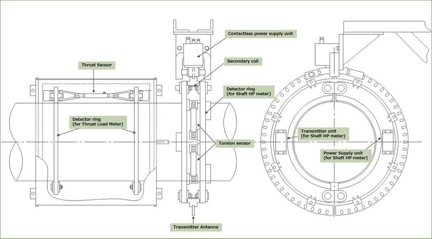 The thrust detector ring is attached to the intermediate shaft with a span of 380 mm, and the thrust sensor is fixed to the mounting arm integrated with each ring. The transmission and power supply of the sensor signal uses the transmission unit and power supply unit of the shaft horsepower detector ring.
