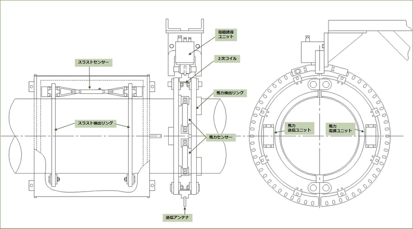 スラスト検出リングは380mmのスパンで中間軸に取り付けられ、各々のリングと一体の取り付けアームにスラストセンサーが固定されます。センサー信号の送信と電源供給は軸馬力検出リングの送信ユニットとパワーサプライユニットを使用しています。